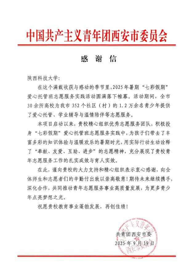 近日,我校收到共青團(tuán)西安市委就感謝我校在2025年暑期“七彩假期”愛心托管班志愿服務(wù)實(shí)踐中的大力支持和精心組織的感謝信。這份肯定既是對(duì)科大志愿者們?cè)凇捌卟始倨凇被顒?dòng)中躬身踐行、熱忱奉獻(xiàn)的高度認(rèn)可,更是對(duì)我校青年志愿服務(wù)工作深耕細(xì)作的充分肯定。