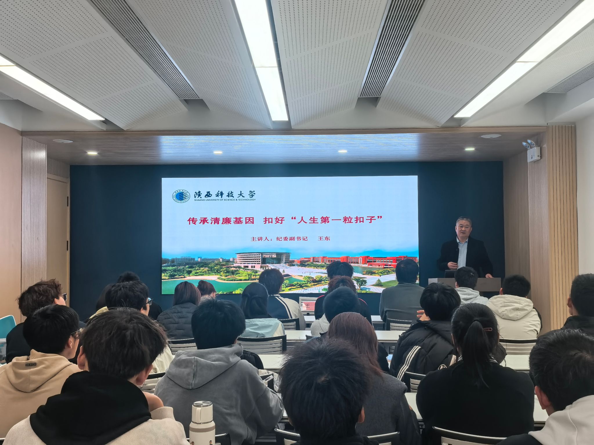 課程圍繞“廉潔修身與行為養(yǎng)成”的主題,從歷史傳統(tǒng)、當(dāng)下實(shí)踐、未來擔(dān)當(dāng)三個(gè)維度展開系統(tǒng)講解。王東結(jié)合學(xué)?!叭齽?chuàng)兩遷”的辦學(xué)歷史與老一輩科大人的廉潔事跡,引導(dǎo)同學(xué)們從優(yōu)秀傳統(tǒng)和校史傳承中汲取精神力量,筑牢信仰之基。他強(qiáng)調(diào),大學(xué)是價(jià)值觀形成的關(guān)鍵階段,要將廉潔自律內(nèi)化為日常行為準(zhǔn)則,在大學(xué)的學(xué)習(xí)生活中筑牢思想堤壩,磨礪高尚品格,自覺抵制不良風(fēng)氣,在行為養(yǎng)成中正心明道、砥礪成長。