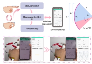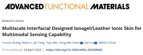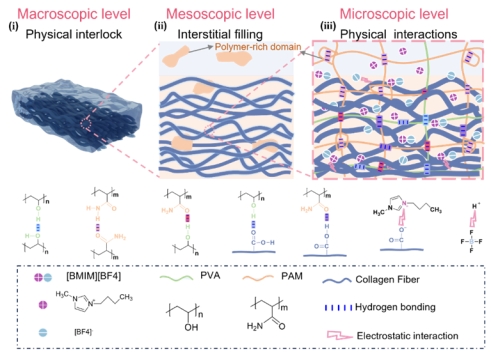 我校輕工科學(xué)與工程學(xué)院(柔性電子學(xué)院)陳詠梅教授團(tuán)隊(duì)在皮革膠原纖維間的豐富間隙中原位聚合形成聚乙烯醇(PVA)-聚丙烯酰胺(PAM)水凝膠,然后在離子液體([BMIM][BF4])中進(jìn)行浸泡處理,通過多尺度界面設(shè)計(jì),即宏觀上,離子凝膠與皮革骨架形成穩(wěn)定的物理互鎖結(jié)構(gòu);介觀上,離子凝膠完全填充膠原纖維間隙并產(chǎn)生體積收縮和相分離;微觀上,在膠原纖維和高分子鏈之間形成大量氫鍵,實(shí)現(xiàn)了離子液體凝膠與皮革的緊密界面結(jié)合,設(shè)計(jì)制備了一種離子凝膠/皮革(VMIL)離子皮膚。此外,離子液體中的陽離子和陰離子可以均勻地分散在 PVA-PAM/IL離子凝膠和皮革骨架的網(wǎng)絡(luò)中,在其內(nèi)部構(gòu)建連續(xù)導(dǎo)電通路。該離子皮膚在可穿戴應(yīng)變、溫度和呼吸傳感方面具有應(yīng)用前景。相關(guān)研究成果以“Multiscale Interfacial Designed Ionogel/Leather Ionic Skin for Multimodal Sensing Capability”為題發(fā)表在《Advanced Functional Materials》上,陜西科技大學(xué)陳詠梅教授和西安交通大學(xué)呂建教授為論文的共同通訊作者。