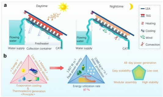 研究團(tuán)隊創(chuàng)新性地集成了大面積低發(fā)射率太陽能吸收器、溫差發(fā)電片與被動式界面蒸發(fā)器,成功構(gòu)建出可全天候連續(xù)運行的水—電聯(lián)產(chǎn)系統(tǒng)。該系統(tǒng)通過耦合增強(qiáng)的太陽能光熱轉(zhuǎn)換與蒸發(fā)冷卻效應(yīng),在顯著提升熱電輸出功率的同時,實現(xiàn)了淡水的持續(xù)高效收集。尤為關(guān)鍵的是,夜間持續(xù)的蒸發(fā)冷卻效應(yīng)使得系統(tǒng)冷端溫度始終低于環(huán)境熱端溫度,從而維持了驅(qū)動系統(tǒng)晝夜連續(xù)運行的穩(wěn)定溫差。