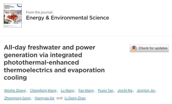 為此,陜西科技大學(xué)材料科學(xué)與工程學(xué)院“光熱材料的功能化調(diào)控與應(yīng)用”創(chuàng)新團(tuán)隊王成兵教授聯(lián)合北京航空航天大學(xué)趙立東教授團(tuán)隊、蘭州交通大學(xué)耿中榮教授,在能源環(huán)境領(lǐng)域頂級期刊《Energy & Environmental Science》(IF = 32.5) 上發(fā)表了題為“All-day freshwater and power generation via integrated photothermal-enhanced thermoelectrics and evaporation cooling”(基于集成光熱增強(qiáng)熱電技術(shù)與蒸發(fā)冷卻的全天候淡水與電力聯(lián)產(chǎn)系統(tǒng))的突破性研究成果。該研究成功構(gòu)建了一種全天候水—電聯(lián)產(chǎn)系統(tǒng),有效克服了上述技術(shù)瓶頸。