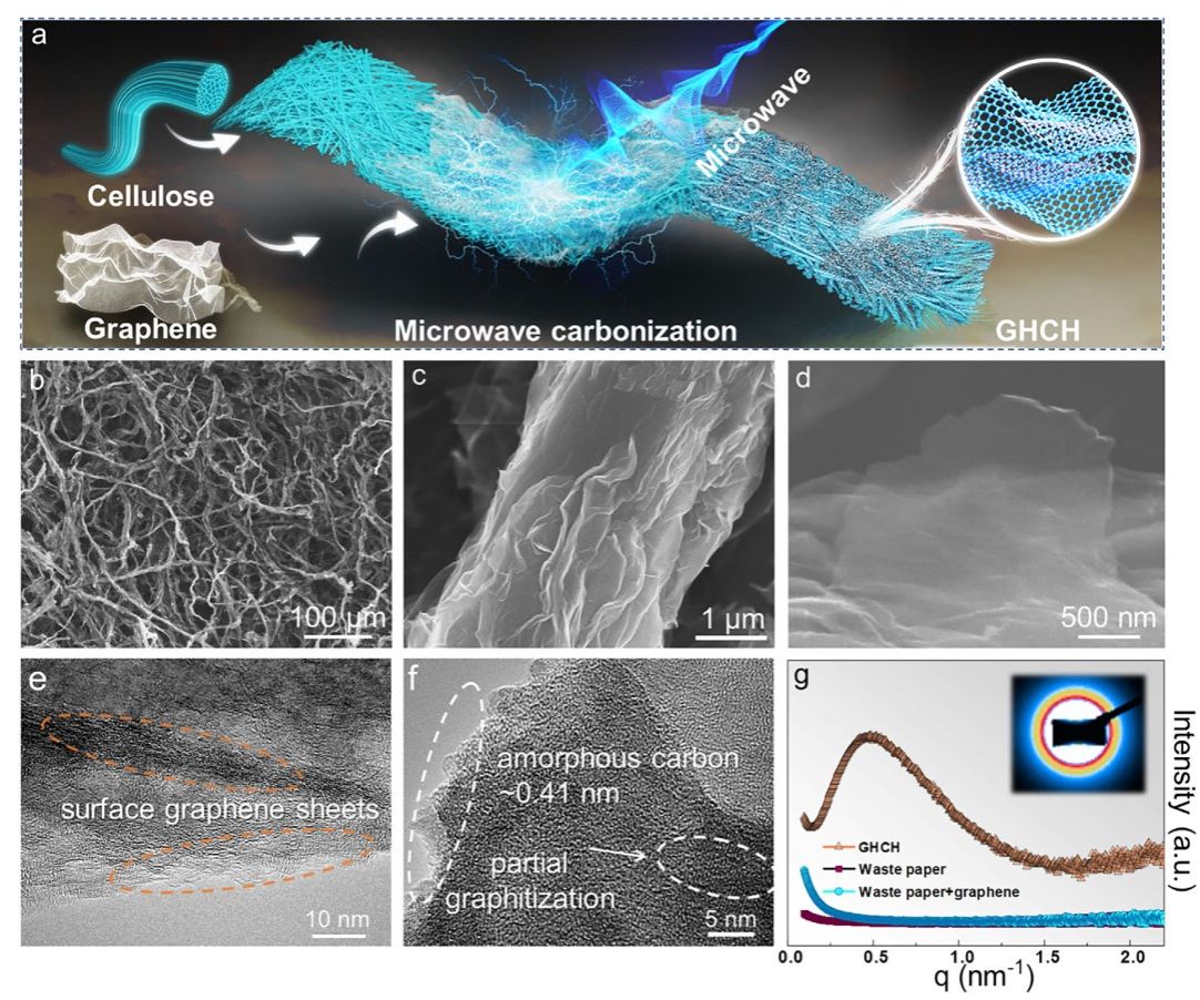 傳統(tǒng)碳化法制備碳材料面臨能耗高、效率低的瓶頸。本研究采用微波碳化技術,利用石墨烯微反應器,在短短 10 秒內快速碳化廢紙,制備出一種由石墨烯與硬碳構成的異質結構碳質電極。通過結合實驗證據與有限元模擬,證實了一種新穎的微波碳化機理:石墨烯吸收微波產生高頻等離子體電磁波,該電磁波“催化”樣品快速吸收微波,導致樣品內部發(fā)生電擊穿從而引發(fā)初步碳化。利用這種超快碳化技術制備的碳質材料作為鉀離子電池負極,展現出高可逆容量和優(yōu)異的循環(huán)穩(wěn)定性??傊?,微波碳化為合成高性能碳基電極提供了一條可持續(xù)且高效的途徑。https://doi.org/10.1002/adfm.202508032
