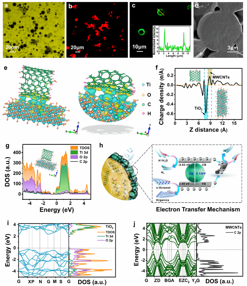 為了突破上述問(wèn)題,本研究開(kāi)發(fā)出由TiO2/MWCNTs穩(wěn)定的Pickering乳液體系,用于界面光催化重整產(chǎn)氫。該體系顯著改善了基底材料間的結(jié)合性、乳液穩(wěn)定性及活性物種傳輸效率。TiO2與MWCNTs通過(guò)靜電吸引和酯化作用相結(jié)合,有效抑制了反應(yīng)過(guò)程中基底粒子的脫落;通過(guò)優(yōu)化條件,在降低界面張力的同時(shí)保障了乳液的穩(wěn)定性;光生電子可有效地從TiO2定向轉(zhuǎn)移至MWCNTs,確保了光生載流子的有效分離。與油-水單相及混合相體系相比,該P(yáng)ickering乳液的光催化重整產(chǎn)氫效率顯著提升。該研究為強(qiáng)化液-液非均相體系光催化重整反應(yīng)提供了新思路。
